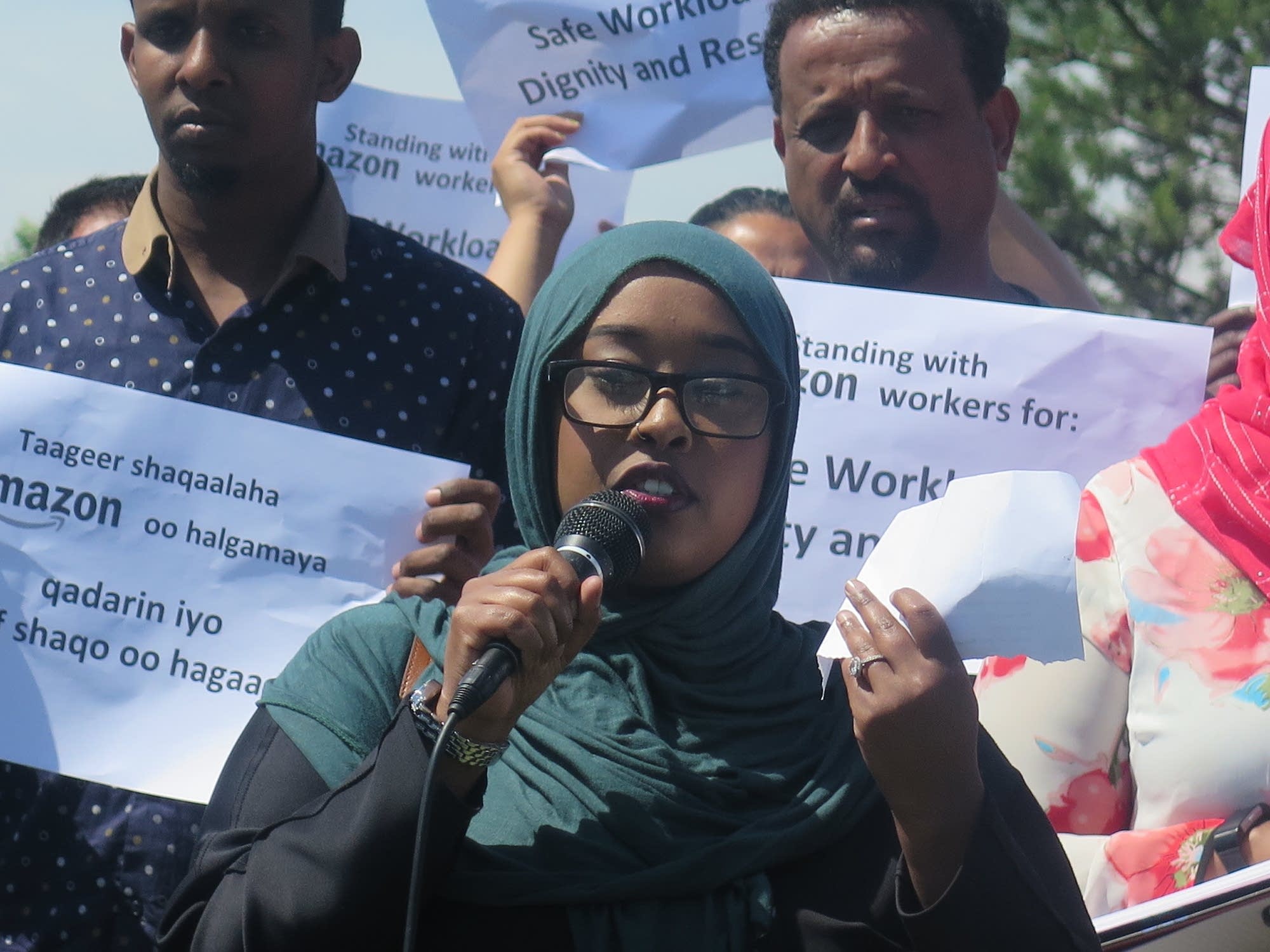 The news conference was called by Minneapolis-based Awood Center, which defends the rights of East African workers. The group has received a couple dozen complaints from workers at the Amazon facility, five of which reported injuries, in the past two months.